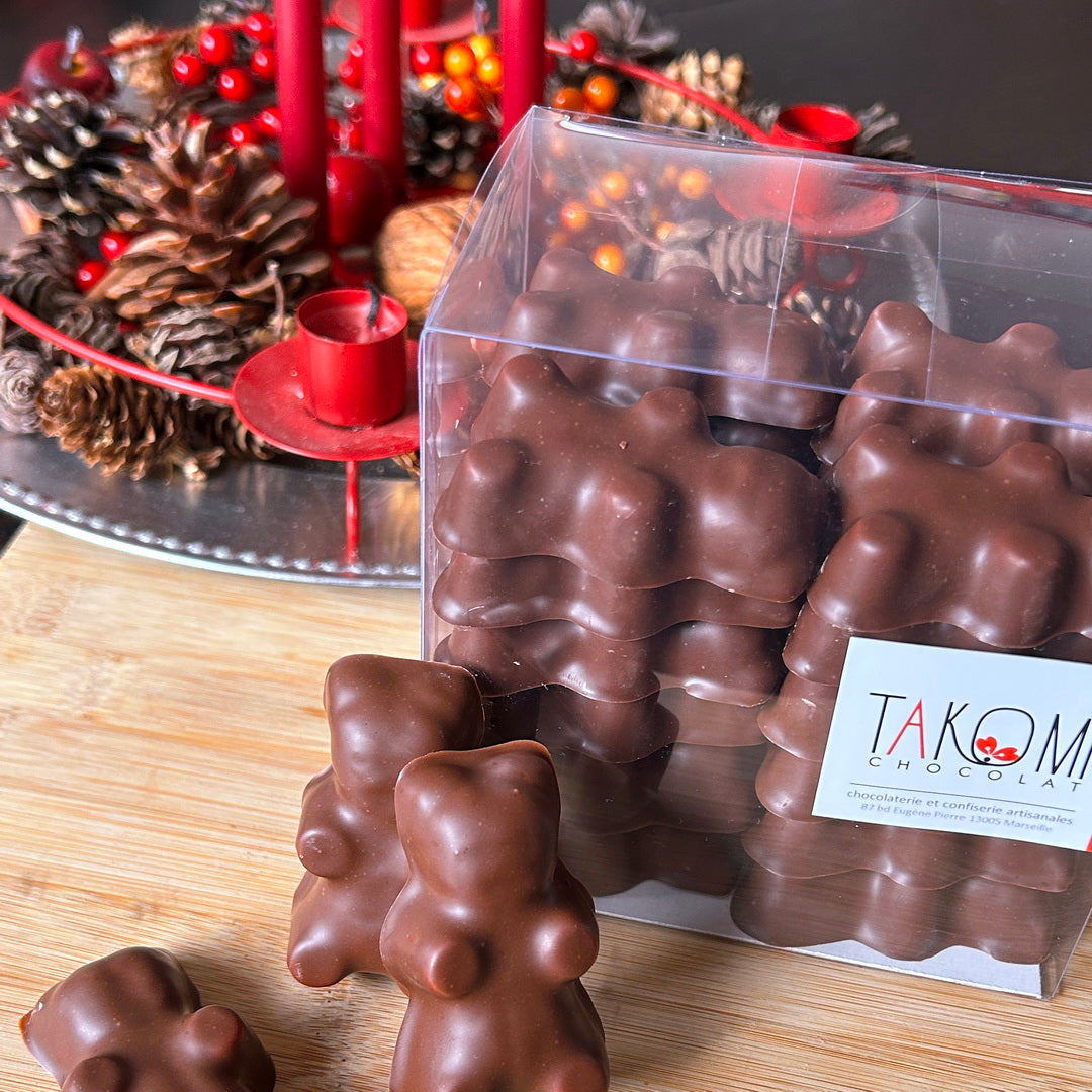 Fabriqués artisanalement, ils naissent un à un dans notre atelier, puis sont patiemment habillés de chocolat avant de rejoindre ce grand coffret généreux.