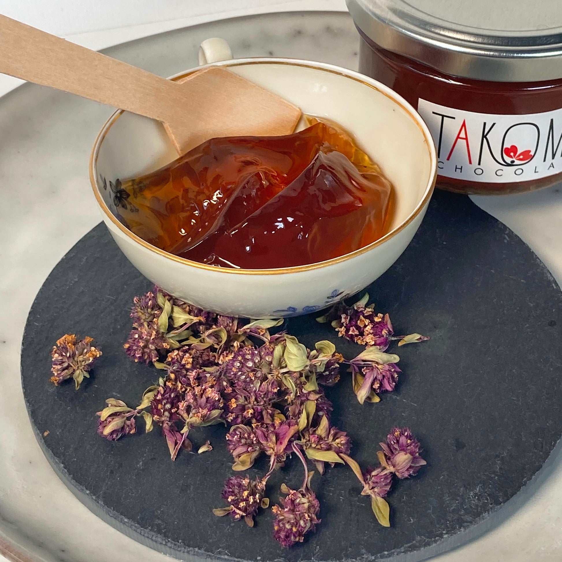 Ingrédients : eau, sucre semoule, fleurs fraîches de thym serpolet sauvage d'Ardèche, gélifiant : agar agar, jus de citron bio.